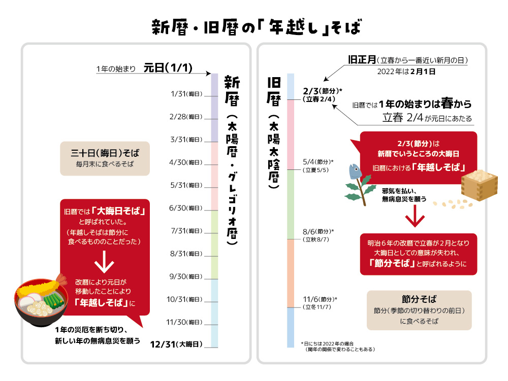 一方、旧暦の元日、いわゆる旧正月は「立春に最も近い朔日(新月の日)」であり、その前日の大晦日に食べるそばは「大晦日そば」と呼んでいました。