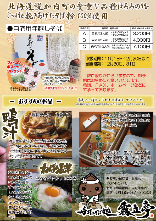 年越しそばのご予約は、 幌加内そば専門店 そば処霧立亭 Yahoo!ショッピング店 または、BASE店 にて承っております。