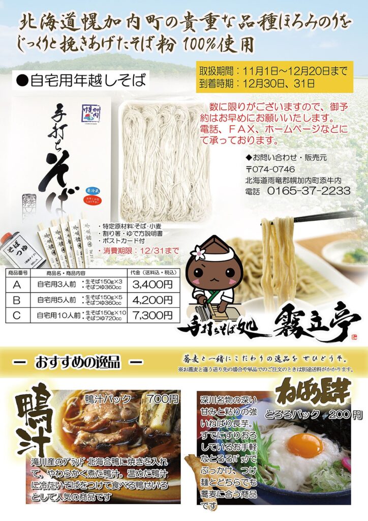 年越しそばのご予約は、 幌加内そば専門店 そば処霧立亭 Yahoo!ショッピング店 または、BASE店 にて承っております。