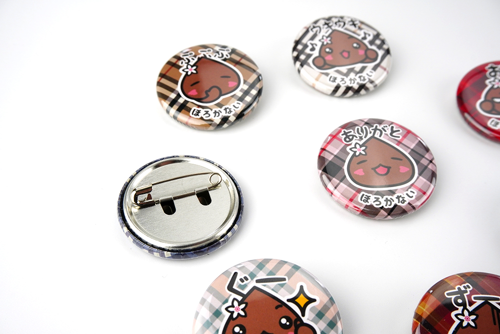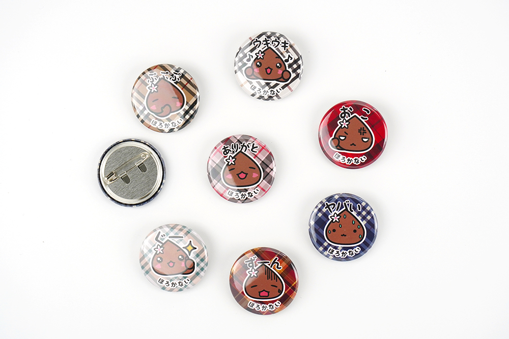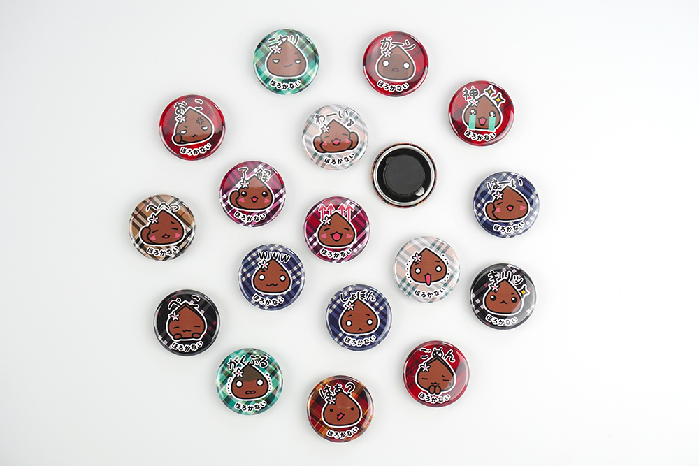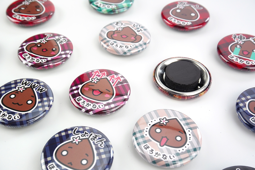 ほろみんの「LINE絵文字」のイラストを使用した缶バッジとマグネットです。